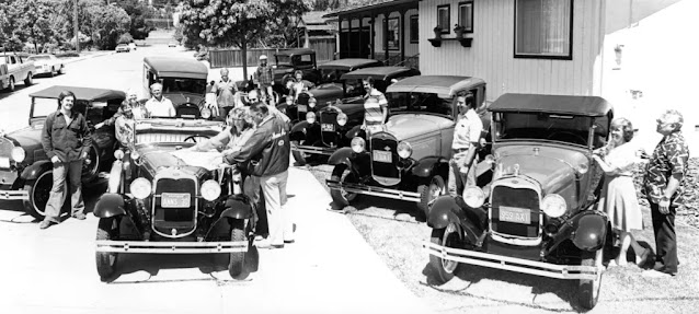 But Marin’s fascination with vintage cars has an even longer history. The photo above was taken 50 years ago, in the 1970s, when a group of residents displayed their classic vehicles, dating from another 50 years earlier, in the 1920s. The back of the photo shows a scribbled note identifying the two people examining the map on the front/left vehicle: Ann Canziani and Eldon Halseth. Since these two were also labeled as president and tour director, respectively, it’s likely the assembled group was a classic car club whose members toured their vehicles around the county.